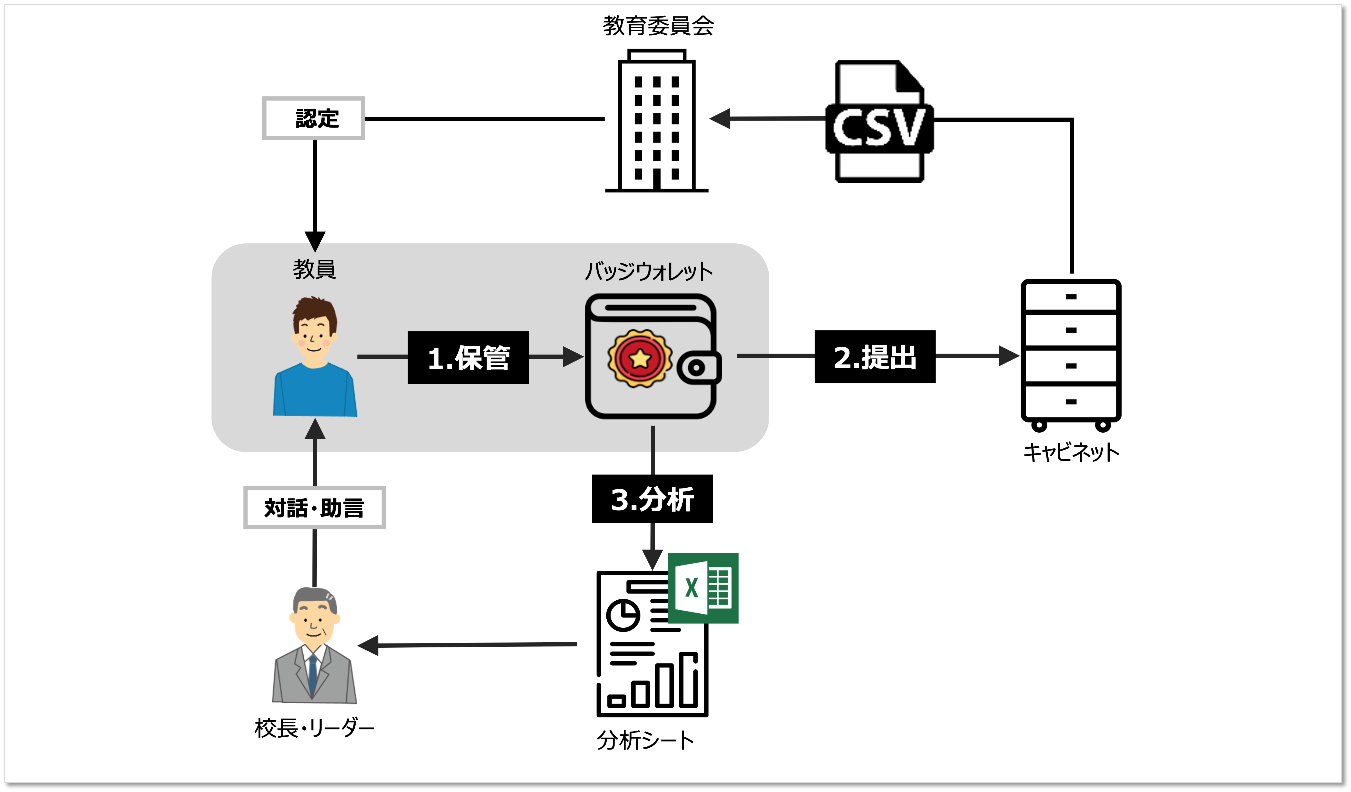 バッジウォレットに保管した能力バッジから，あなたが獲得したスキルや成果を分析できます。分析結果をエクセルで出力し，学校内で共有することも可能です。